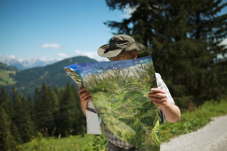 Man in Hiking gear studying a map looking for the direction while hiking in the european alps