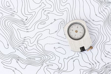 Topographic map with contour lines. Geographic terrain grid, relief height elevation. Ground path pattern. Travel and navigation, cartography design element. Vector illustration