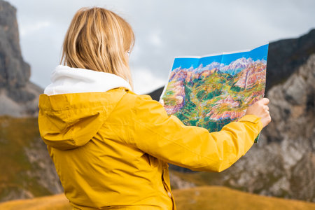 Back side of traveler woman searching the right way on the map in mountains, traveling and lifestyle concept.