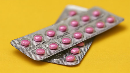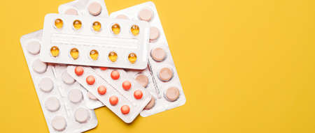 Blister packs of contraceptive pills on yellow background. Hormone pills for treatment hormone acne. Birth control pills. Estrogen and progesterone hormone pills. Pharmacy banner. Prescription drugs.