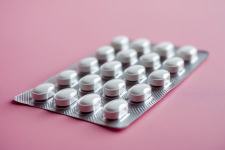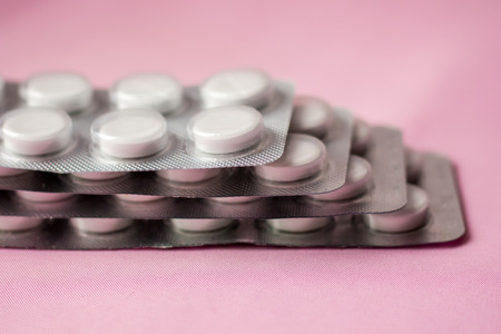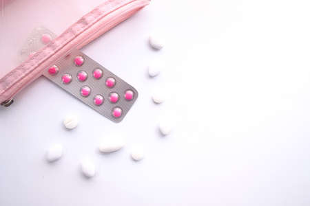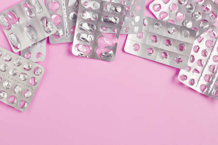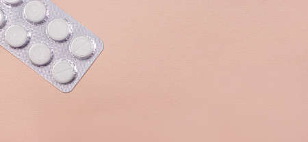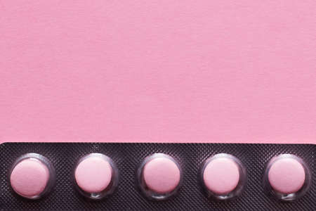 White blister of pills on pink background. Simple flat lay with pastel texture with copy space. Medical concept. Stock photography.