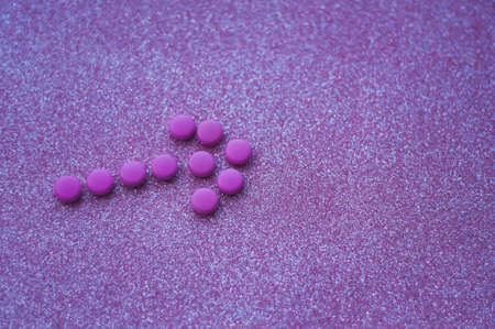 Medication concept. Diclofenac use for relief pain and reduce muscle inflammation. Many violet pills isolated on white background, selective focus and copy space.