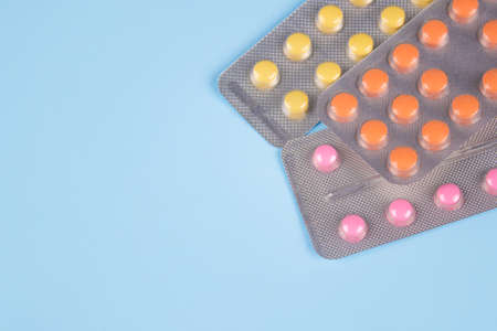 Assorted medicine pills, capsules and tablets in blisters on blue background with copy space for your text. Immune system vitamins and supplemets. Dietary bio supplements. Selective focus