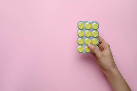 Woman holding blister with cough drops on pink background, top view. Space for text