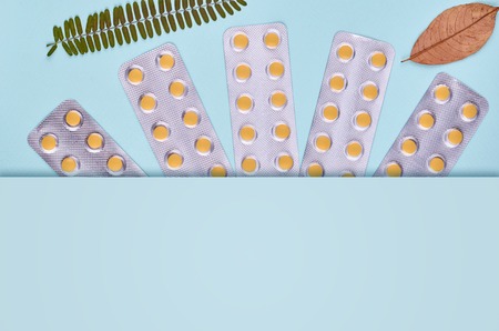 The tablets are packaged on a beige light background with a place to text a banner for a medical clinic. Medicine and pharmacy, disease treatment