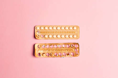Female oral contraceptive pills empty and full blister on a pink background. Female contraceptive hormonal birth control pills. The concept of pregnancy planning. Copy space, flat lay.