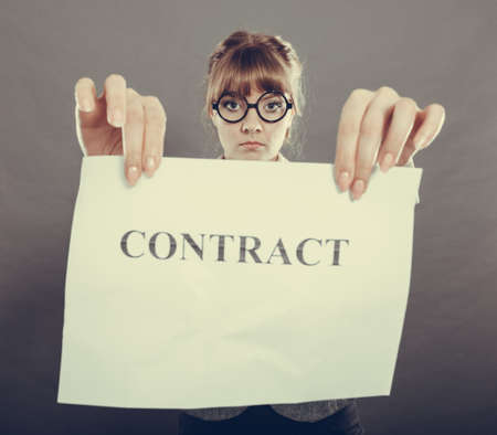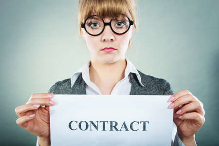 Business, documents and legal concept - serious unhappy businesswoman showing crumpled contract
