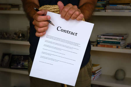 Tied hands holding pen and tearing contract paper in front of bookcase. Bound man hands rip paper contract, breach of contract. Unfair agreement. Lorum Ipsum text