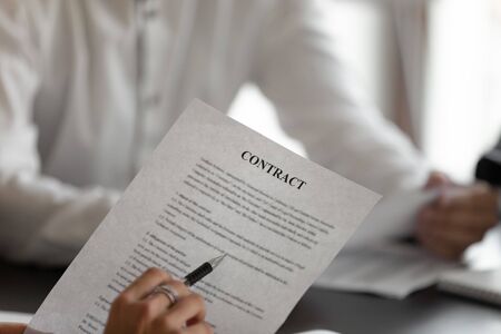 Close up hand business woman at the table in office. Concept of business contract studying reading and signing, business office