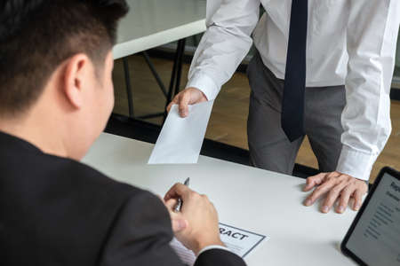 Employee sending resignation letter to boss employer consider in order to contract for quit or layoff of job leaving from work, resignation concept.