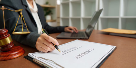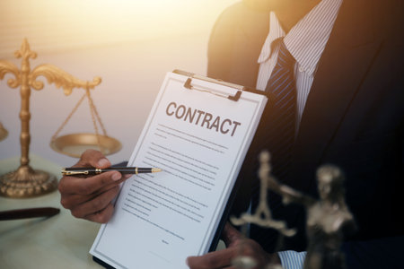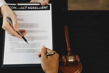 Lawyers or judges sign documents in accordance with legal and fair terms of agreement, Legal Ethics and Integrity, scales of justice, law hammer, Litigation and legal services.