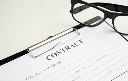 White table with paper contract detail and empty space to sign authorized signature, props with glasses and ink pen, copy space on the left.