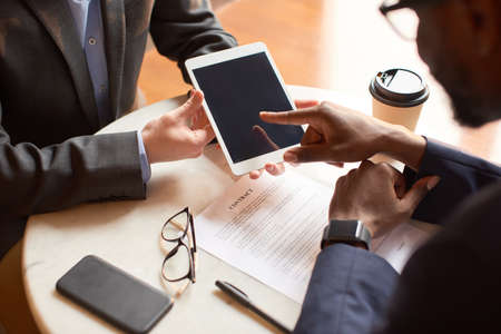Cropped view of businesswoman pointing at contract while partner singing in restaurant