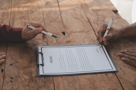 Close up view of job interview in office, focus on resume writing tips, employer reviewing good cv of prepared skilled applicant, recruiter considering application, hr manager making hiring decision