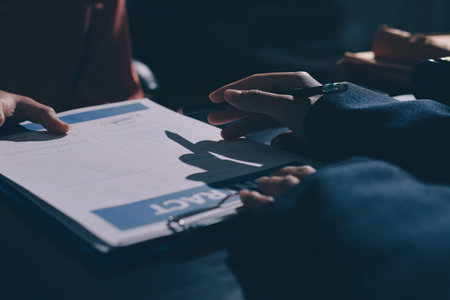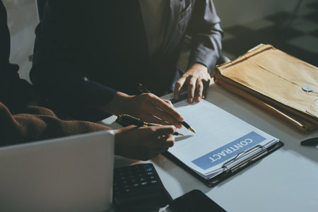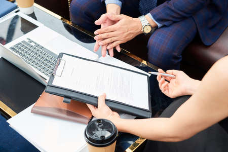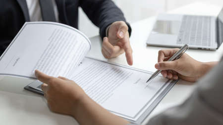 Close-up of businessman signing a contract at the table while having a consultation with lawyer at the table at office
