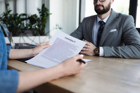 Cropped view of candidate holding contract near blurred manager during job interview