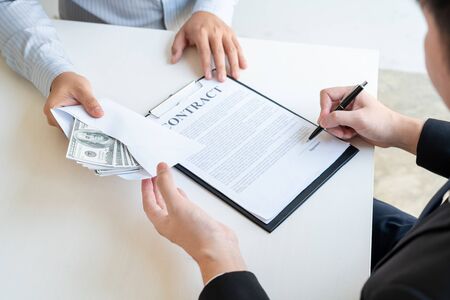Bribery and corruption concept, bribe in the form of dollar bills, Businessman giving money while making deal to agreement a real estate contract and financial corporate.
