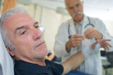man's leg hurts. Patient receiving a first aid. Nurse bandaging a wound.