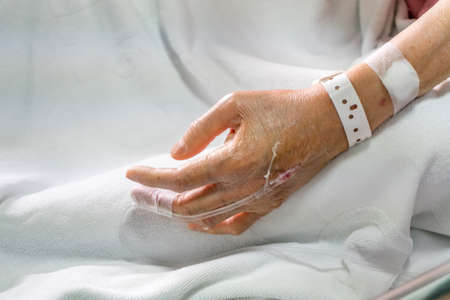 Hand with IV catheter in ward bed closeup. Aged patient undergo clinic treatment. Unrecognized senior person arm with intravenous therapy lying in operating room. Healthcare medical system concept.