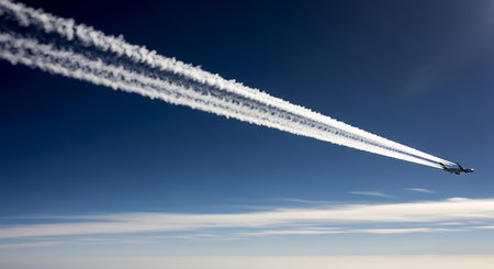 An airplane flying in the sky and releasing chemtrail clouds in a long, horizontal line. The blue sky is beautiful, AI Generated.