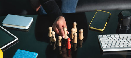 Woman showing wooden human figures. Recruitment. Leadership