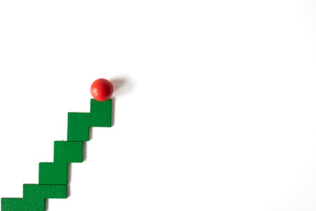 A red sphere rests on the top of ascending green steps, symbolizing achievement and progress. Minimalist concept on white background, representing reaching goals.