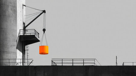 This striking image captures an industrial crane lifting a bright orange cylinder, set against a monochrome backdrop, showcasing urban architectural elements.