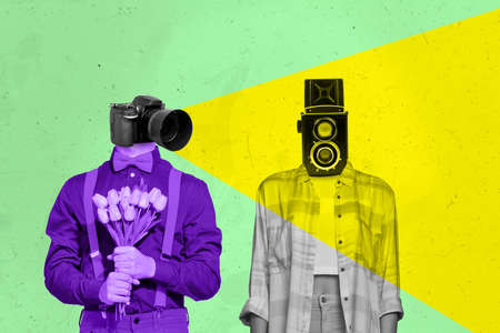 Composite collage picture of two people purple black white colors photo camera instead head isolated on drawing background