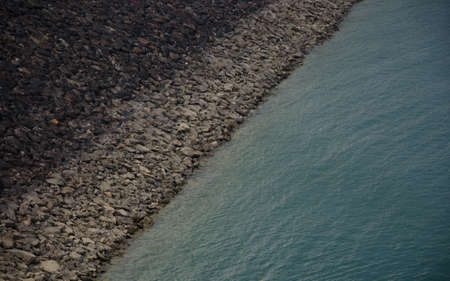 A captivating aerial view showcasing a water reservoir with a dark concrete wall, contrasting against the serene blue of the water surface, highlighting natural beauty.