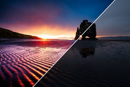 Awesome dark sand after the tide. Location Hvitserkur, Vatnsnes peninsula, Iceland, Europe. Amazing scene. Images before and after. Original or retouch, example of photo editing. Beauty of earth.