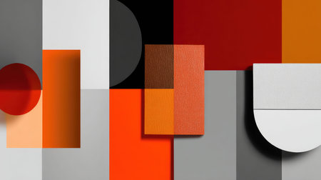 This abstract composition showcases a vibrant arrangement of geometric shapes and textures in various shades of red, gray, orange, and white, ideal for artistic projects.