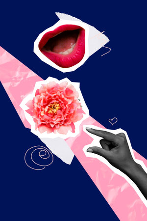 3d sketch poster trend collage of human hand show spring peony flower bloom international woman day mouth lips pink pomade