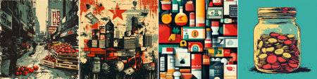 Vector detailed illustration depicting a dynamic representation of a rationing economy, blending vintage style with modern design elements to convey