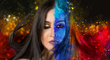 High fashion model woman. Art multicolored skin girl face portrait closeup. Glamour professional makeup