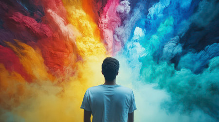 A person gazes in awe at a stunning display of colorful smoke, swirling in shades of red, blue, and yellow, against a serene backdrop during sunset.