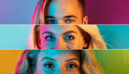 Collage of cropped male and female faces, eyes placed on the right isolated over light colored backgrounds in neon lights.