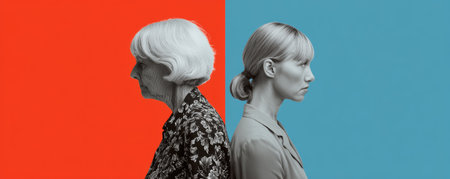 Elderly woman senior profile younger woman profile split background contrast generational gap monochrome side view Tense