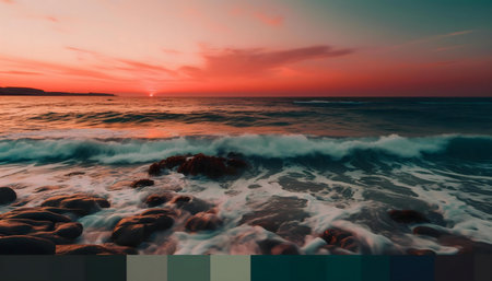 Cityscape divided by sunset and sunrise, displaying the contrast between day and night with vivid colors