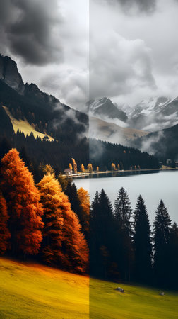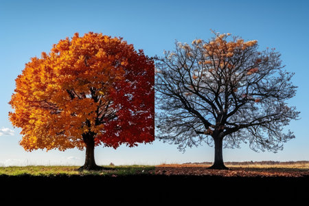 In the comparison of a vibrant fall woodland to a bleak, lifeless terrain, focus on leaf intricacies over distant hills blurriness