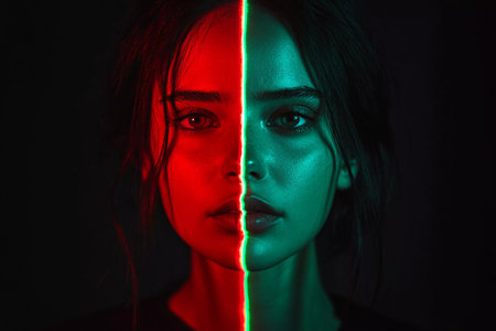 A striking portrait features a woman with a face divided by vibrant red and green hues. The dramatic lighting showcases her features, creating an intense atmosphere.
