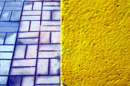 Yellow and grey concrete wall as texture or background. Geometric style. Plastered surface. Poor-quality walls painting.