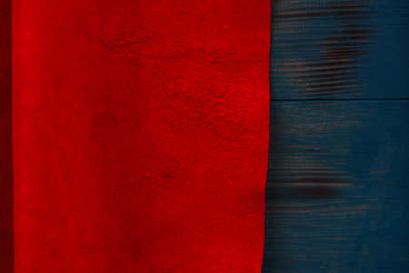 Red matte background of suede fabric, closeup. Velvet texture of seamless leather. Felt material macro. Red suede texture. Fabric, leather, material for designers.