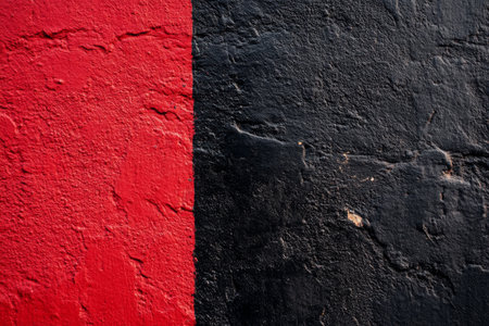 Two textured wall panels, one black and one red, meet at a sharp edge, enhanced by a narrow golden line. The rough surfaces suggest weathering and age in an urban environment.