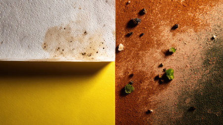Close-up view of dirt and grime on textured paper contrasts with a vibrant colored background, showcasing a visually striking abstract composition.