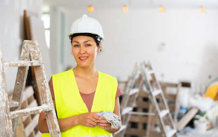 female construction worker with toolbox before room renovation
