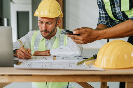 multi ethnic engineer brainstorming and measuring for cost estimating on paperworks and floor plan drawings about design architectural and engineering for houses and buildings.
