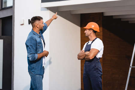 Customer pointing with finger at facade of building near workman outdoors