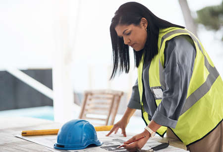Making some minor adjustments. Cropped shot of an attractive young female construction worker looking over plans on site.