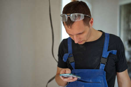 Handyman using mobile phone in demolish apartment