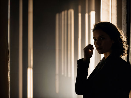 The profile of a man is highlighted in shadow against a gentle light, evoking a sense of introspection and mystery in a monochromatic setting.
